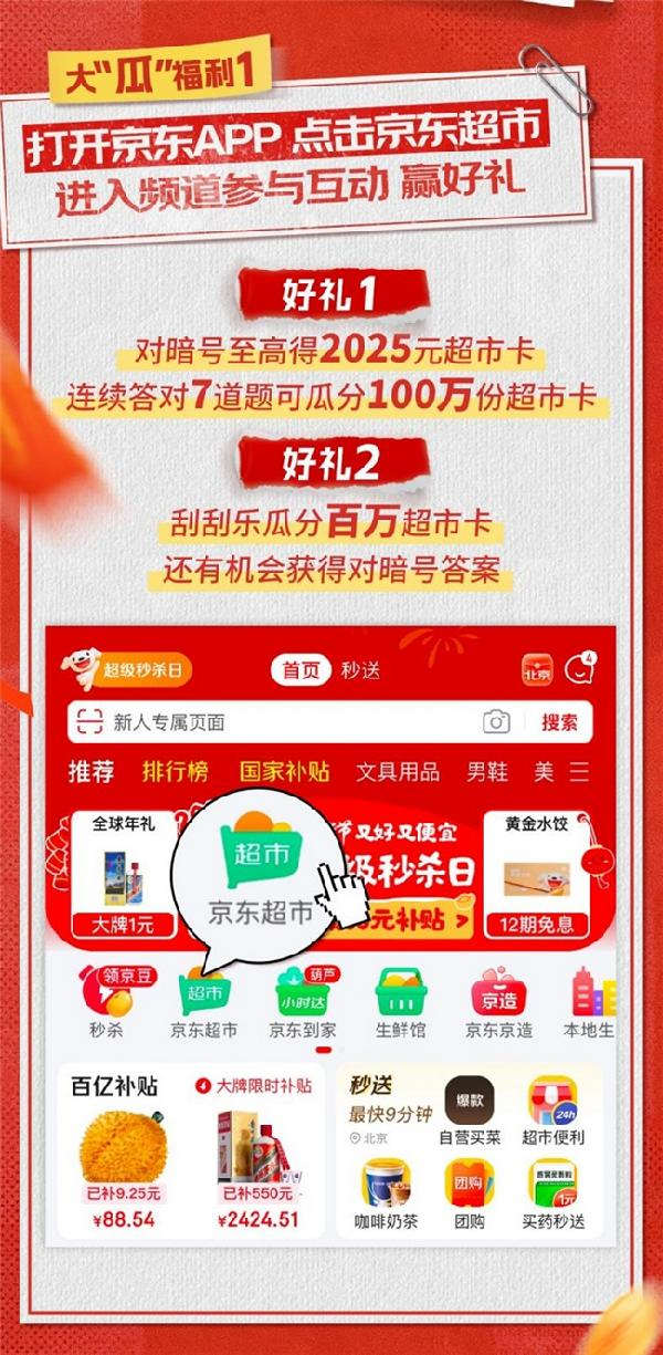 在京东超市频道,消费者可以通过参与对暗号互动游戏,至高赢得2025元京东超市卡大奖,连续答对7道题即可获得瓜分100万份京东超市卡的资格。同时,京东超市还为消费者准备了刮刮乐游戏,玩刮刮乐游戏可瓜分百万京东超市卡,还有机会获得对暗号的答案。