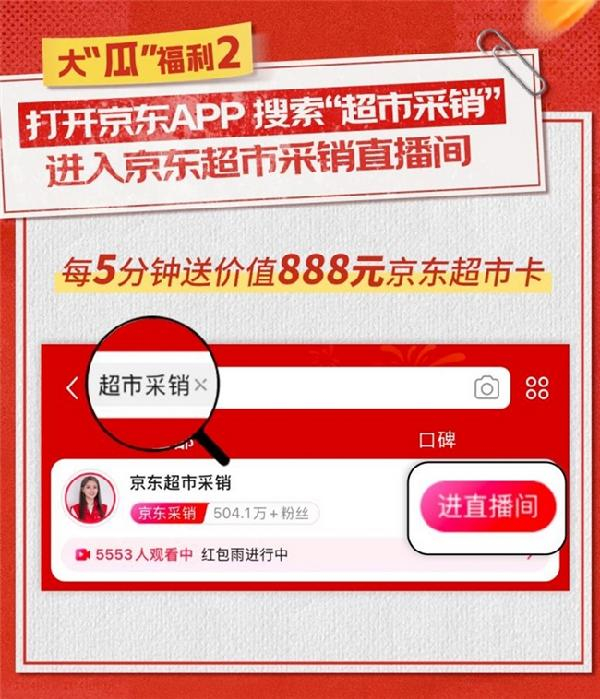 此外,打开京东APP搜索“超市采销”,进入京东超市采销直播间,消费者每5分钟可参与抽取价值888元的京东超市卡,更有金鱼经典洗涤灵、伊利QQ星儿童成长奶粉、吉得利0脂肪油醋汁等1元秒杀活动,以及海天薄盐礼盒、吉香居暴下饭礼盒、京鲜生智利进口车厘子、百草味纯坚果礼盒等超多爆款好物直降活动。