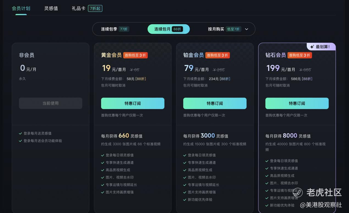 此外,技术的颠覆也有望催生全新的商业模式与业态,成为数字经济时代商业增长的新引擎。就可灵AI自身来说,面向C端用户,推出了会员付费模式,连续包月首月最低价19元、次月58元,可生成约66个视频或3300张图片。