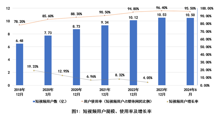 报告显示,近年来,短视频用户规模和使用率一直保持增长态势,从2018年12月至2023年12月的五年间,短视频用户规模从6.48亿增长至10.53亿,使用率也从78.2%增长至96.40%,用户规模和使用率均达到峰值。然而,五年来短视频用户增速持续放缓,用户增长率从19.33%下降到4.05%。直至2024年上半年,用户规模首次出现回落。截至2024年6月,我国短视频用户数为10.50亿,较2023年12月减少300万;用户使用率也从96.40%回落至95.50%。
