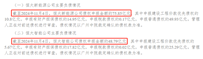 今年8月,广州中院分别裁定受理恒大汽车的两家子公司恒大新能源汽车、恒大智能汽车两宗破产重组案,并指定北京市中伦(深圳)律师事务所担任管理人。11月8日,管理人发布公告,宣布招募上述两家公司重整案的意向投资人,并披露了目前的债务情况。