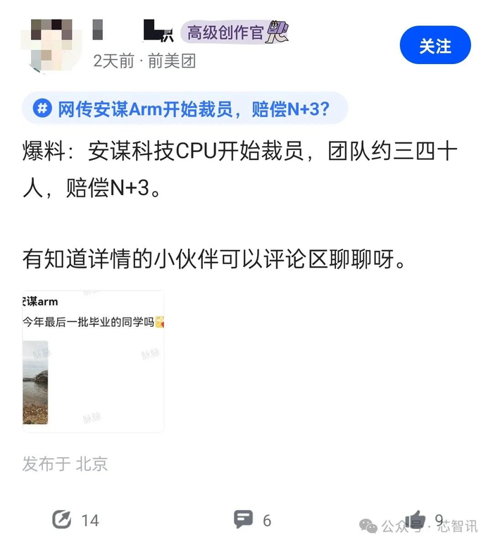 12月30日消息,近日,有网友在某社交平台爆料称,国内半导体IP大厂安谋科技(Arm中国)的CPU部门将裁员,目前该部门约30-40人,补偿方案为“n+3”,年终奖可正常发放,社保将会交到明年2月份。