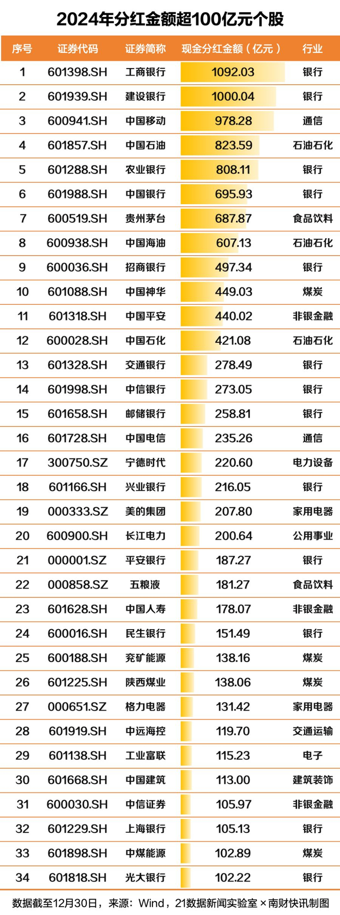 多家头部公司狂撒“红包雨”。从分红金额来看,年内共有34家上市公司分红超百亿元。其中,工商银行年内分红1092亿元,排名第一;建设银行紧随其后,分红金额为1000亿元;中国移动位列第三,分红金额为978亿元。中国石油、农业银行分红金额均超800亿元,位列第四、第五。排名第六至第十的个股分别为中国银行、贵州茅台、中国海油、招商银行、中国神华。