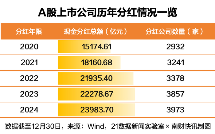 数据显示,截至12月30日,今年已有3973家上市公司实施现金分红,分红总额约2.4万亿元,创历史新高。近五年来,A股上市公司累计现金分红超10万亿元。