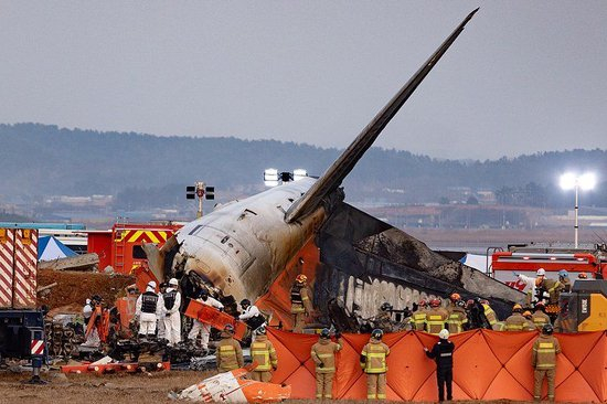 当地时间12月29日,一架韩国济州航空的客机在位于韩国全罗南道的务安机场着陆时,偏离跑道后撞上机场围墙。除2人获救外,机上其余179人全部遇难,这是在韩国国内发生的伤亡最严重的空难事故。(总台记者 张昀)