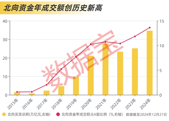 据证券时报·数据宝统计,截至12月27日,2024年北向资金合计买卖总额34.63万亿元,相较2023年增长37.85%,北上资金成交金额创历史新高。从占比数据来看,2024年北上资金成交金额占A股成交额比例进一步提升至13.61%,续创历史新高。