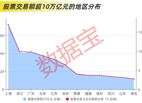 股票交易中,上海、浙江、广东的股票交易额位居前三位,分别达71.85万亿元、41.98万亿元和41.37万亿元,占比合计达36.58%。