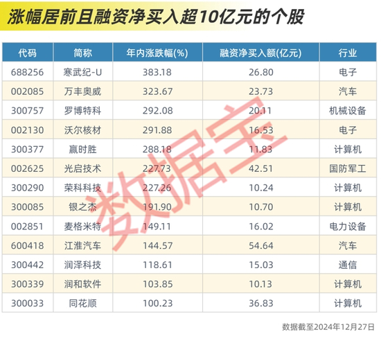 数据宝筛选了2024年融资净买入超过10亿元,且股价涨幅超100%的个股,共有13只。寒武纪-U年内获得26.8亿元融资净买入,股价年内大涨383.18%,涨幅居首。