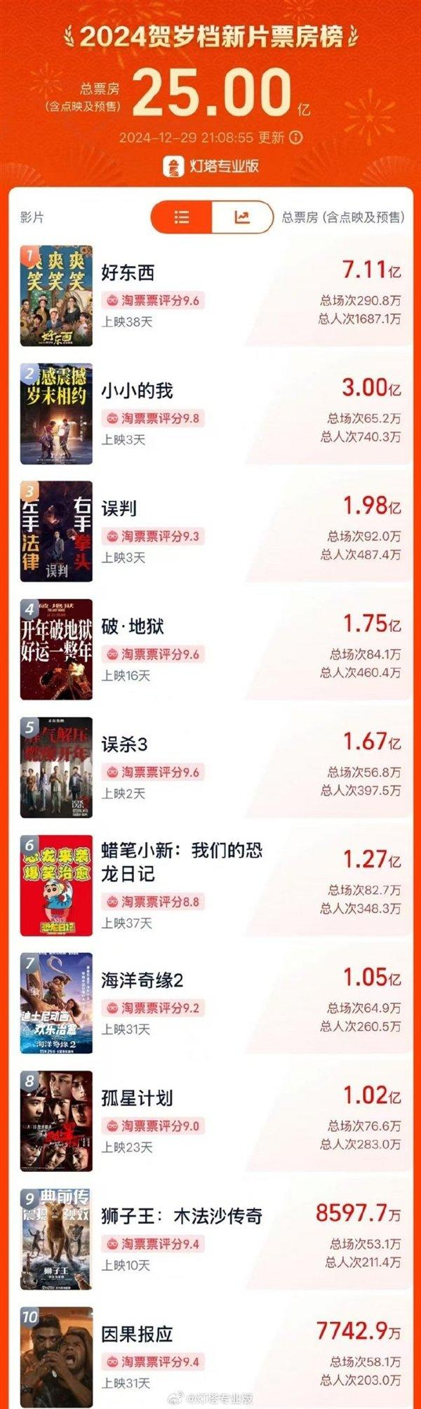 2024年贺岁档总票房破25亿,《小小的我》涨势迅猛
