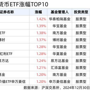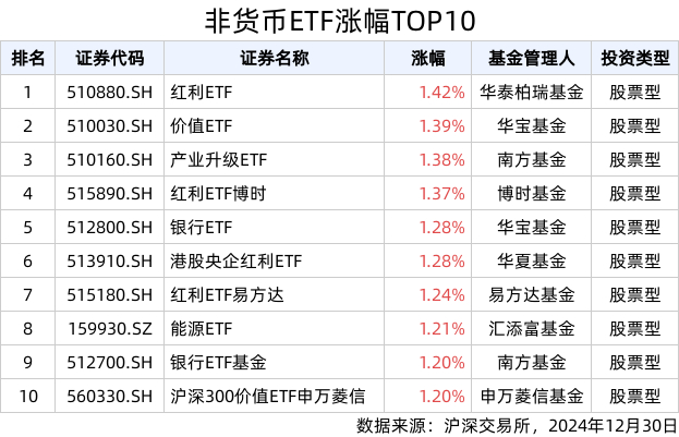 ETF英雄汇(2024年12月30日):红利ETF(510880.SH)领涨、标普消费ETF(159529.SZ)溢价明显