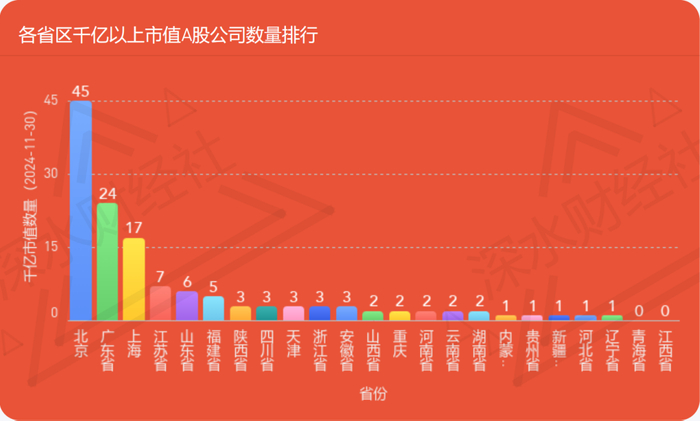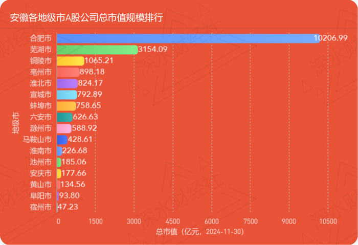 截至11月30日,安徽共有48百亿市值A股公司,位居各省区第八位。