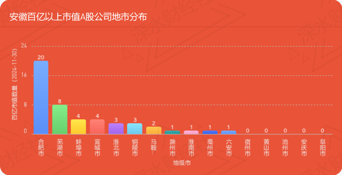 今天发布的是【2024年11月安徽省千亿和百亿市值A股公司数量排行榜】。