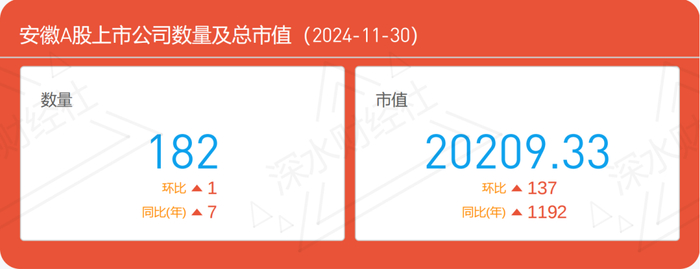 截至2024年11月30日,安徽共有182位居各省区第七位;合计总市值2.02万亿,位居各省区第10位。。