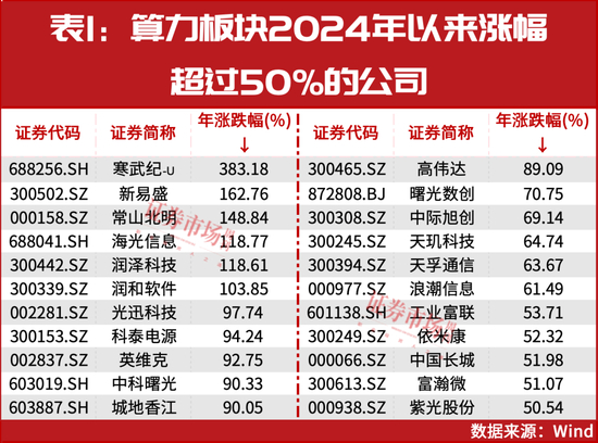 此外,新易盛、常山北明和海光信息等同样迎来大涨,算力板块合计共有6只个股年内迎来股价翻倍上涨(见表1)。