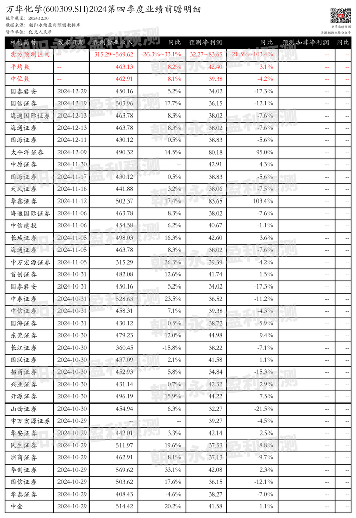 季度业绩前瞻 | 万华化学:预计04月01日公布四季报,预测Q4营收315.29~569.62亿元,同比-26.3%~33.1%
