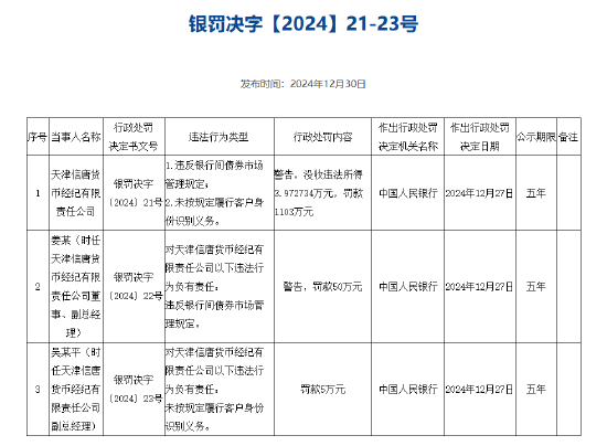 12月30日金融一线消息,银罚决字【2024】21-23号显示,天津信唐货币经纪有限责任公司因违反银行间债券市场管理规定、未按规定履行客户身份识别义务,被警告,没收违法所得3.972734万元,罚款1103万元。