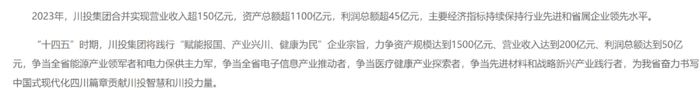 2023年,川投集团合并实现营业收入超150亿元,资产总额超1100亿元,利润总额超45亿元,主要经济指标持续保持行业领先和省属企业领先水平。“十四五”时期,川投集团将力争资产规模达到1500亿元、营业收入达到200亿元、利润总额达到50亿元。