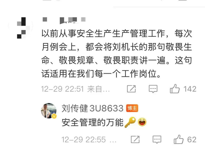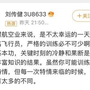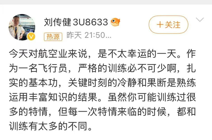 “对航空业来说,是不太幸运的一天。作为一名飞行员,严格的训练必不可少啊,扎实的基本功,关键时刻的冷静和果断是熟练运用丰富知识的结果。虽然你可能训练过很多的特情,但每一次特情来临的时候,都和训练有太多的不同。”
