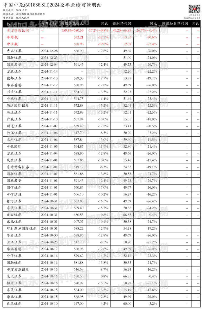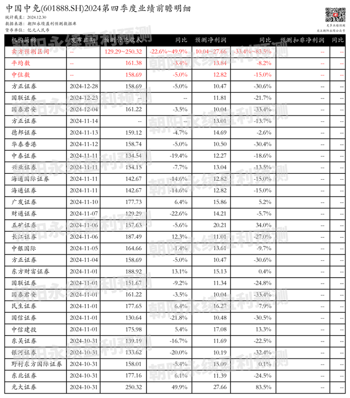 截至2024年12月30日,根据朝阳永续季度业绩前瞻数据: