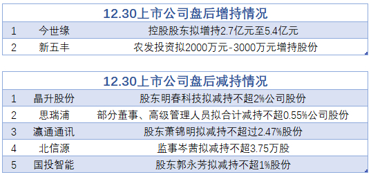 据统计,12月30日,盘后包括今世缘新五丰在内的2家A股上市公司披露增持情况,包括晶升股份、思瑞浦瀛通通讯北信源、国投智能在内的5家A股上市公司披露减持情况。