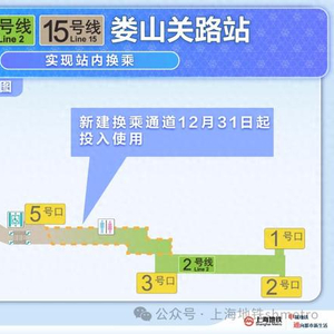 申通地铁集团介绍,经各方协作推进、加紧施工,上海轨道交通2号线、15号线娄山关路站地下换乘通道改造工程竣工并将于明天(12月31日)起正式启用。该通道投用后,乘客换乘从地面转入地下,换乘时间也将由原来的约15分钟缩短为9分钟左右。详见↓