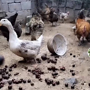 视频中,一女子手提一篮车厘子倒入鸡圈,有鸡、鸭探头出来吃。随后镜头一转,车厘子撒在地上,不少鸡、鸭惬意啄食。