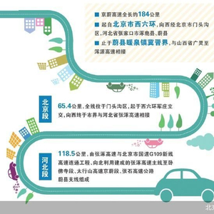 据悉,京蔚高速路线起自北京市西六环,向西经北京市门头沟区,张家口市涿鹿县、蔚县,止于蔚县暖泉镇冀晋界,与山西省广灵至浑源高速相接,路线全长184公里。其中,北京段65.4公里,全线位于北京市门头沟区,起于西六环军庄立交,向西终于市界与河北省张涿高速公路相接;河北段118.5公里,由张涿高速与北京市国道G109新线高速连通工程、向北利用建成的张涿高速主线至卧佛寺段、太行山高速京蔚段、张石高速公路蔚县支线组成。