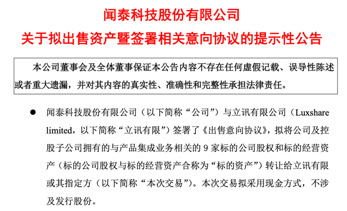 12月30日晚间,闻泰科技发布公告称,公司与立讯有限(Luxshare limited)签署了《出售意向协议》,拟将公司及控股子公司拥有的部分与产品集成业务相关的标的公司股权和标的经营资产转让给立讯有限或其指定方。