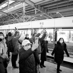 12月30日上午,市民们纷纷来到地铁3号线(李达站至南李官站)的各个站点打卡。站台门上张贴了红彤彤的“对联”,暖融融的氛围感十足。在工业大学站上车的马女士领着自己4岁的儿子瓜瓜在“空中地铁”坐了一大圈儿。