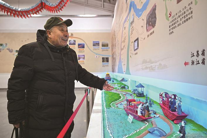 2024年12月15日,北京市通州区漷县镇马头村运河艺术馆内,赵义强向观众展示通州运河船工号子,观众跟随他一起做起了表演动作。