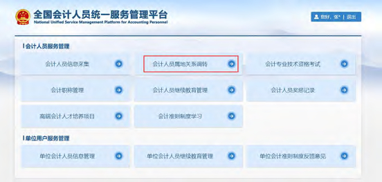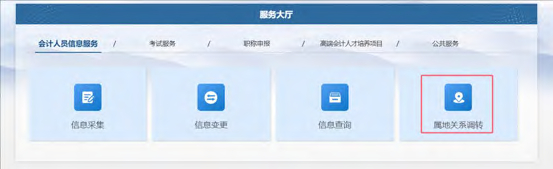 登录成功后,点击首页的会计人员属地关系调转进入到会计人员信息调转页面,或者会计人员信息服务下的属地关系调转。