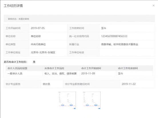 会计专业职务为非必填,如果填写了会计专业职务需要选择会计专业职务聘任时间(会计专业职务聘任时间不能早于工作开始时间)以及上传聘任证明。在填写完工作经历信息后页面表格会回显填写完的信息,可以进行查看详情、编辑以及删除操作.