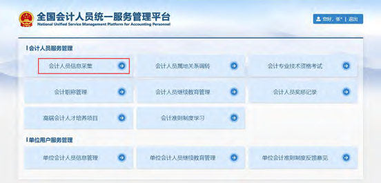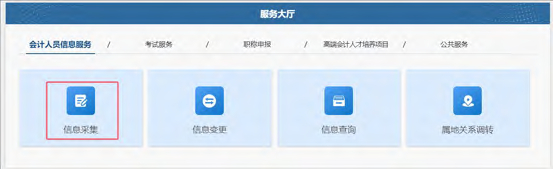 登录成功后,点击首页的会计人员信息采集进入到信息采集页面,或者会计人员信息服务下的信息采集。