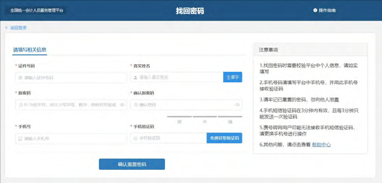 填写证件号码、真实姓名、新密码、确认新密码、手机号以及验证码后点击确认重置密码。填写信息请与注册时所填信息一致,否则重置不成功。