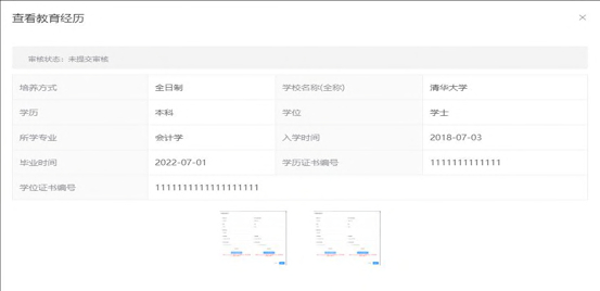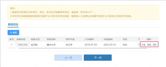 在填写完教育经历信息后页面表格会回显填写完的信息,可以进行查看详情、编辑以及删除操作