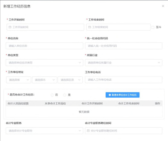 3.4.工作经历 教育经历页面点击下一步进入到工作经历页,在工作经历页中点击新增进行工作经历的信息采集。选择工作开始时间和工作结束时间,工作结束时间可以选择至今,如果选择至今则需要上传本单位统一社会信用代码证明。在填写完单位名称、统一社会信用代码、单位类型、所属行业、工作单位地址、工作单位电话后选择是否有会计工作经历。若选择是需要新增本单位会计工作经历。