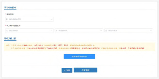 信息采集未完成或者信息采集尚未通过,存在审核中的信息变更申请、调转申请、奖惩申请以及视同教育申请。选择的调入地管理机构与当前所属管理机构相同。这些情况不允许提交调转申请,在提交时页面会有提示。提交调转申请必须要上传调转证明材料,工作岗位变动请上传统一社会信用代码证或工作单位证明,学籍变动请上传录取通知书、学生证或其他学习证明,户籍或居住地变动请上传身份证、户籍证明或居住证明。信息填写完成并上传完证明材料后提交审核。