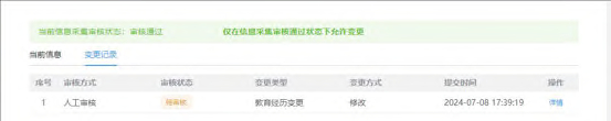 变更保存后,可在教育经历表格上方,当前信息的右侧,点击变更记录查看已提交的教育经历变更记录。信息包括审核方式、审核状态、变更类型、变更方式以及提交时间。点击详情可以查看详细信息,并且变更信息会标红显示。