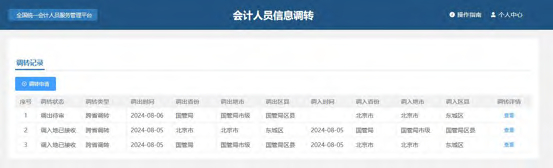 提交完调转申请后,在会计人员信息调转页面可以查看已提交的调转申请。信息包括调转类型、调出省市县、调入省市县、调出时间、审核状态以及证明材料预览。