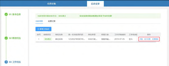 点击左侧工作经历,进入到工作经历变更页面。页面显示信息采集时新增的工作经历,可以进行查看详情、变更、变更删除的操作。也可以继续新增工作经历,但新增工作经历时间不得和已新增的工作经历时间交叉。