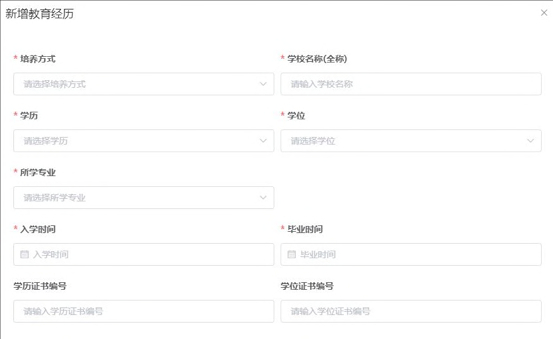 3.3.教育经历 在教育经历页中,点击新增进行教育经历的信息采集。新增教育经历弹窗包括培养方式、学校名称、学历、学位(填写已取得证书的学历、学位)、所学专 业、入学时间、毕业时间、学历证书编号、学位证书编号以及根据所填信息上传必要的附件。