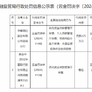 12月31日金融一线消息,国家金融监督管理总局云南监管局行政处罚信息公开表显示,华夏银行股份有限公司昆明分行因流动资金贷款管理不审慎、个人贷款管理不审慎、贷款风险分类不审慎、未落实授信条件发放贷款等违法违规行为,被云南金融监管局罚款225万元。