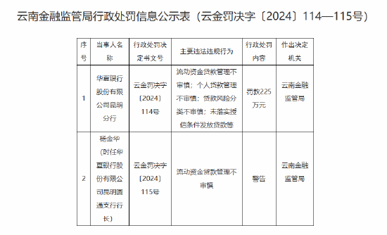 华夏银行昆明分行被罚225万元:因个人贷款管理不审慎 未落实授信条件发放贷款等违法违规行为