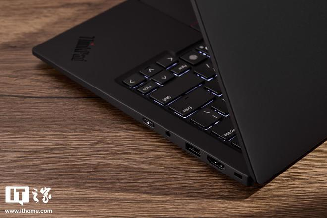 机身右侧则是配备了安全锁孔、HDMI 2.1 接口、USB-A(5Gbps)、3.5mm 音频接口。两枚 USB-A 和 HDMI 接口的加入无疑能为需要投屏演示的商务人士提供更多便利。另外,ThinkPad X1 Carbon 2025 Aura 的电源键也放在了机身的右侧,对于经常盒盖外接显示器的用户来说可以省去开盖开机唤醒的麻烦。