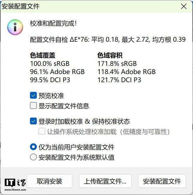色彩方面,ThinkPad X1 Carbon 2025 Aura 支持 100% P3 广色域覆盖。IT之家实测,其可以覆盖 99.5% 的 DCI-P3 色域,色彩容积可达 121.7% 的 DCI-P3。在色准的表现上,平均 △ E 为 0.18,最大 △ E 为 2.72。ThinkPad X1 Carbon 2025 Aura 这块屏幕无论是色彩的丰富程度还是色准均表现十分出色。