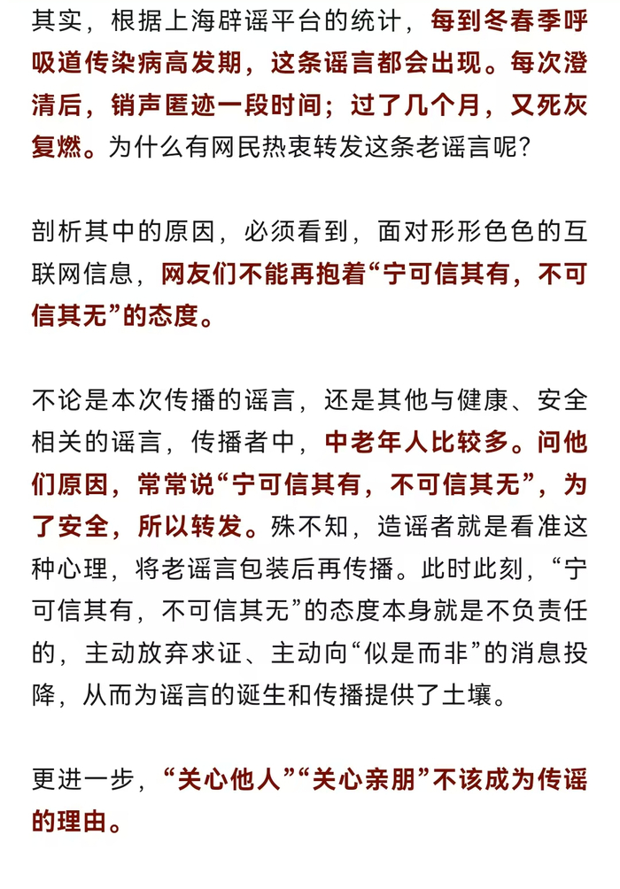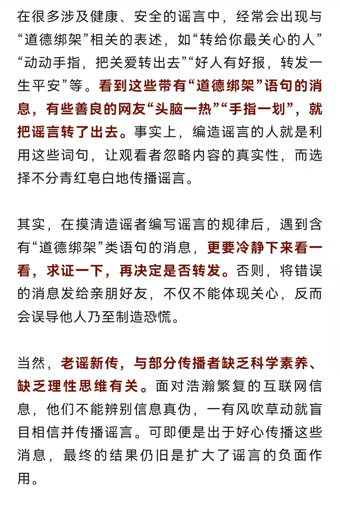 更何况,有些将老谣言“捡”起来传播的人,本身就有不可告人的秘密。他们中,有的是为了博眼球,靠流量获益;有的是为了吹嘘自己能耐大、有“内部消息”;有的意在推销、带货;还不排除一些人出于政治目的或其他不良动机,故意制造和传播谣言,以扰乱社会秩序。不论哪种,造谣传谣行为都有违道德,更涉嫌违法,必须受到严厉打击。