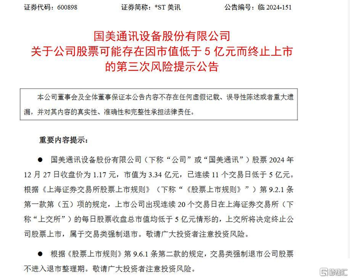 2024年10月30日,主板市值退市新规正式落地,如同一把锋利的手术刀,精准地切割着市场的泡沫与风险,如今这把“刀”即将迎来它的“首杀”——*ST美讯(600898.SH)。