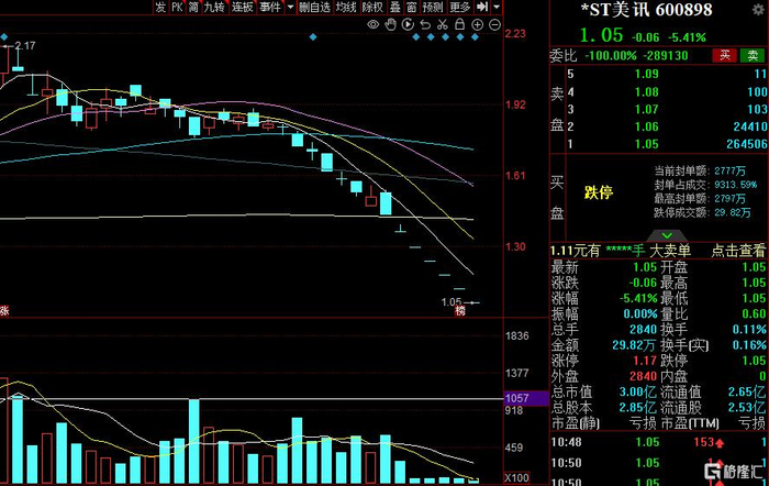 截至发稿,12月31日,*ST美讯仍旧跌势不止,七连跌停,报1.05元/股,总市值3亿元。