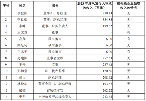 2023年,汉朔科技的董事长、总经理侯世国的薪酬为310.43万元,董事、副总经理李良衍的薪酬为354.83万元,董事、财务负责人李峰的薪酬为199.62万元,监事会主席赵建国的薪酬为252.63万元,监事王丹的薪酬为237.62万元,职工代表监事彭如意的薪酬为120.56万元,副总经理张力的薪酬为208.62万元,董事会秘书、副总经理林长华的薪酬为193.62万元,首席技术官的薪酬为梁敏的薪酬为262.22万元,电子价签产品线负责人申明的薪酬为213.62万元。上述十位高管的薪酬合计2353.77万元,每位高管的平均薪酬超过235万元。