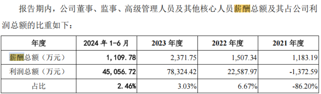由此可见,汉朔科技将用约25%的募集资金补充流动资金。从2021年至2023年以及2024年1-6月份(以下简称报告期),该公司没有进行现金分红,但值得注意的是,该公司的董高监等高管的薪酬总额持续增长,报告期内,汉朔科技的高管薪酬合计分别为1183.19万元、1507.34万元、2371.75万元和1109.78万,占当期利润总额的比例分别为-86.2%、6.67%、3.03%和2.46%。